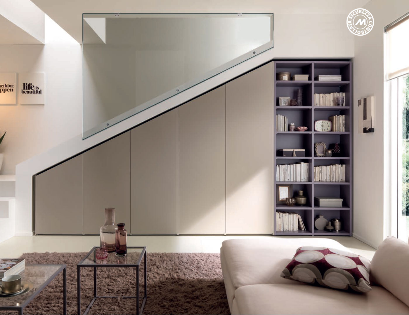 l’armadio che vediamo è sviluppato con ante a taglio diagonale, ma in questo caso per un sotto scala