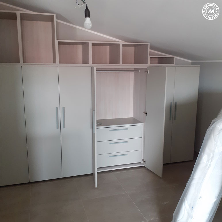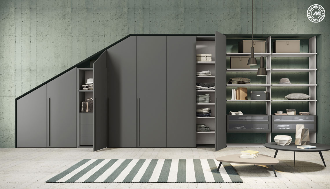 Anche in mansarda è possibile arredarla con l’armadio, a taglio mansardato e a scalare, le due tipologie sono: la prima è con le ante a taglio diagonale o ante debordanti, la seconda è con i moduli armadi a scalare.