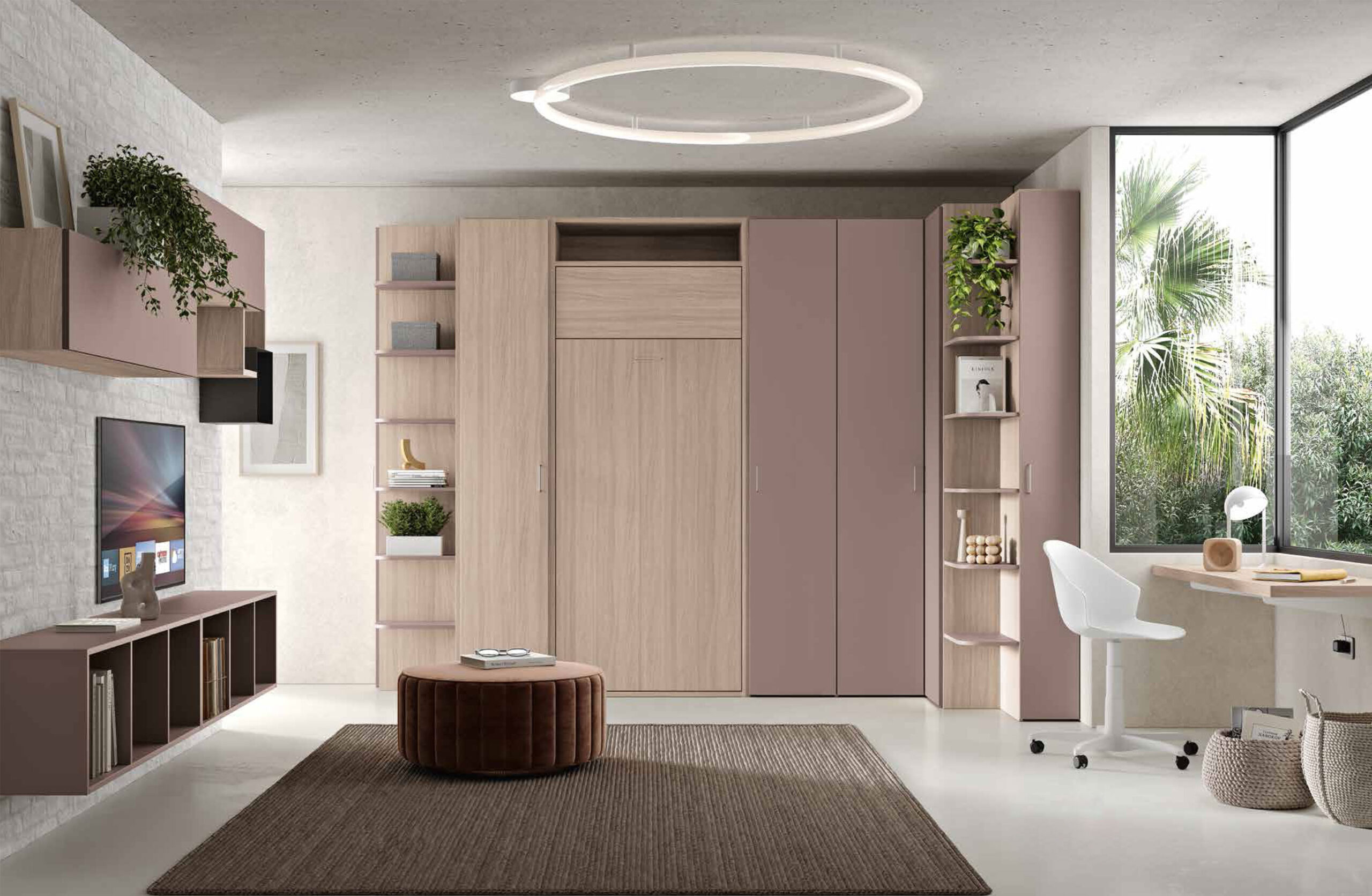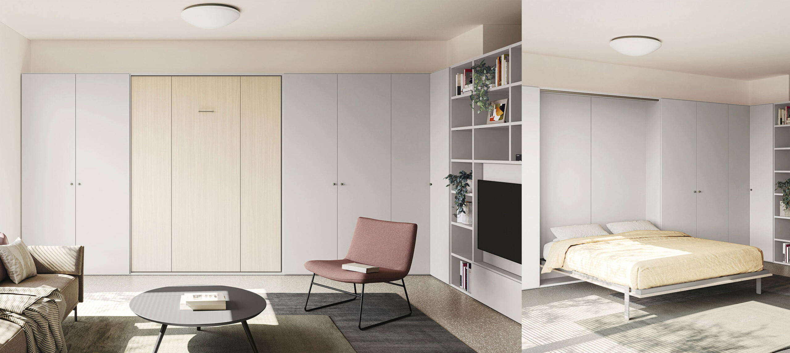 Un esempio di appartamento ideale per studenti fuori sede. L’appartamento è arredato con un mobile letto matrimoniale trasformabile, un armadio e la zona studio con mensole sospese