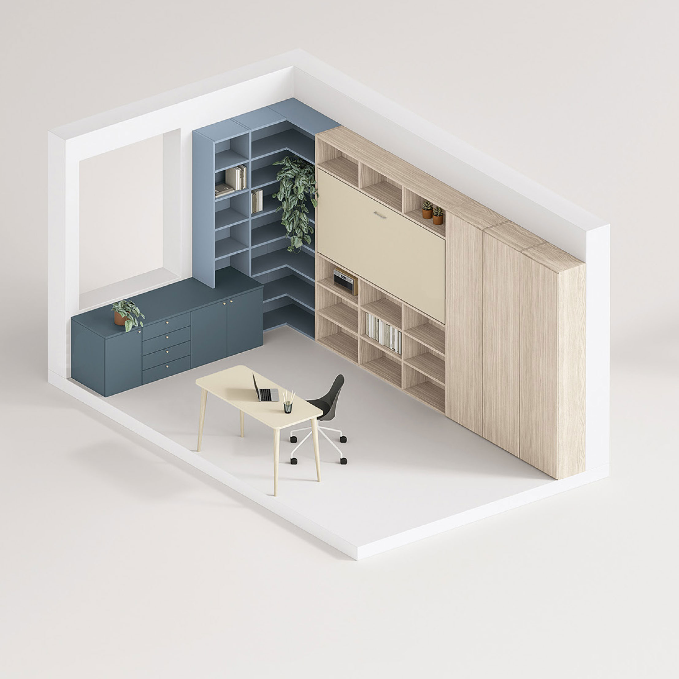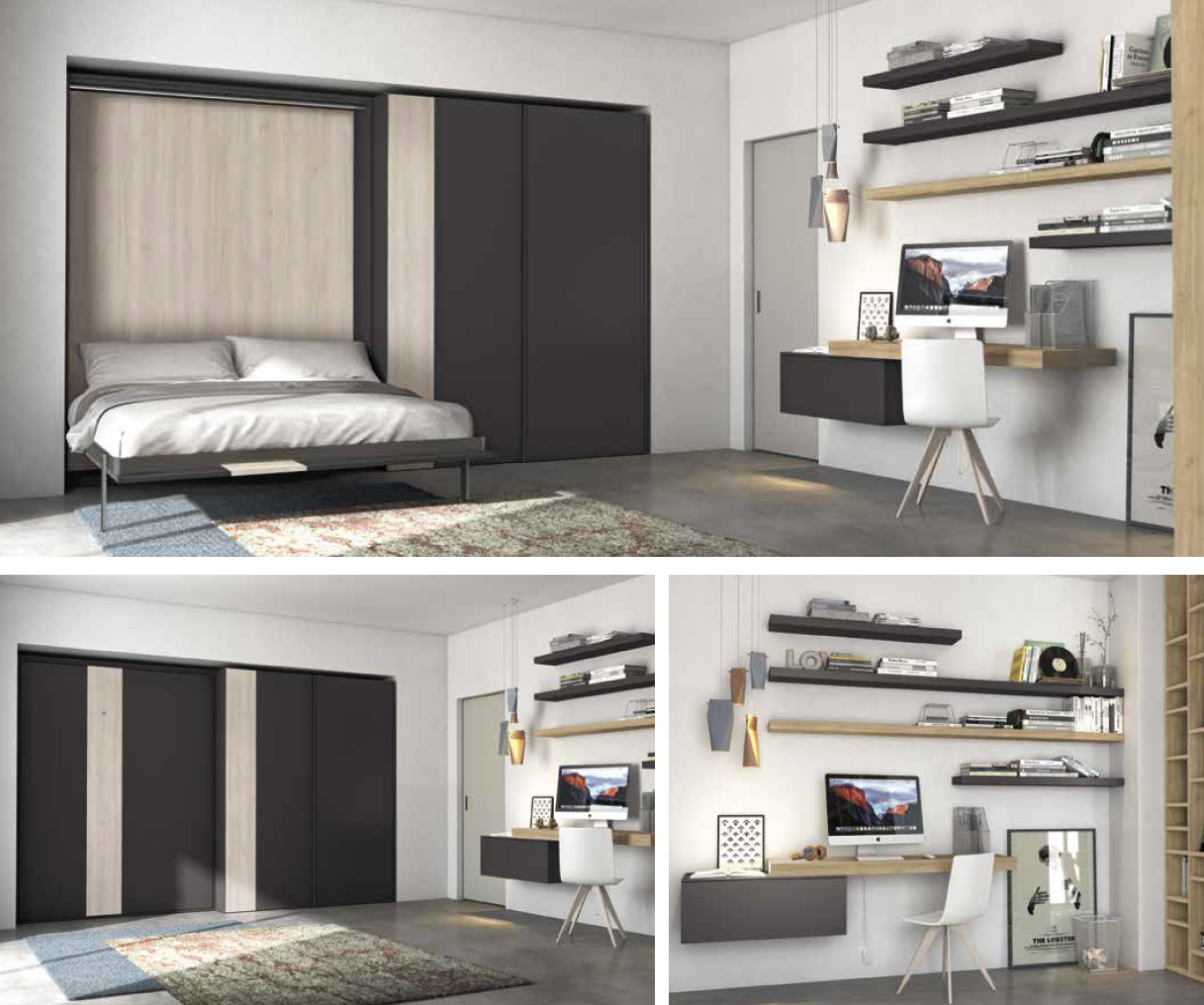 La prima soluzione è ricavata in uno studio oppure camera degli ospiti inserendo un letto trasformabile singolo orizzontale, ma nello stesso spazio possiamo inserire un letto trasformabile matrimoniale.